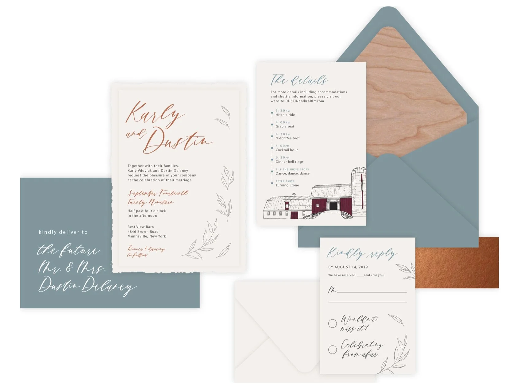 Karly and Dustin’s wedding design was the perfect sum of who they are as a couple: outdoorsy but elegant, always bringing the fun factor, cool and laid-back balanced out with excitement. We paired cool hues with natural tones and copper foil with blind debossing to make the perfect mix — with a pop of “Best View Barn Red” to bring it all together.
